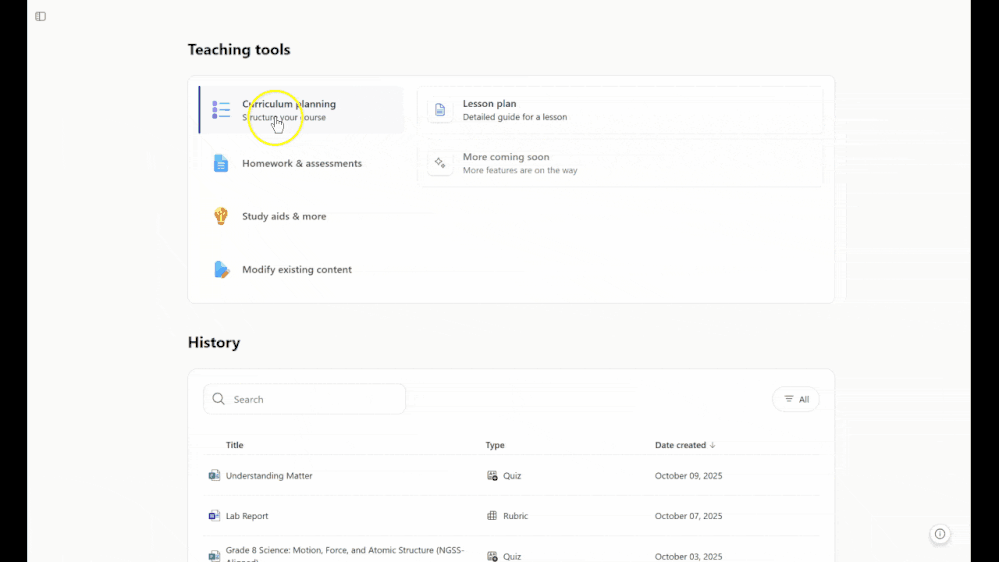 Curriculum planning tools in Teach empowers educators to design, organize, and adapt instructional materials with ease. By leveraging AI-powered tools, teachers can create lesson plans, activities, and assessments that align with educational standards and meet the diverse needs of their students. Whether starting from scratch or refining existing resources, curriculum planning provides a guided, flexible approach to support effective teaching and learning.