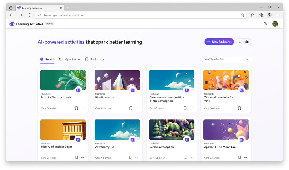 We’re excited to share that Learning Activities are now generally available for all educators and students 13+! Learning activities is a new Microsoft Education experience designed to help educators and students transform passive content into active learning. With just a few clicks, educators and students can now create engaging practice activities like flashcards directly from existing learning content.
