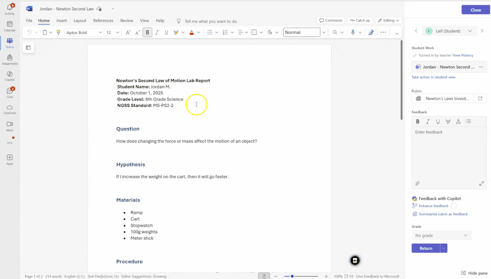 Suggested AI feedback is a new feature that makes it easier for you when you want to provide feedback to students as part of your Assignments flow. Use the Feedback field as a scratchpad as you review the student work, and have AI help enhance and summarize it for you.