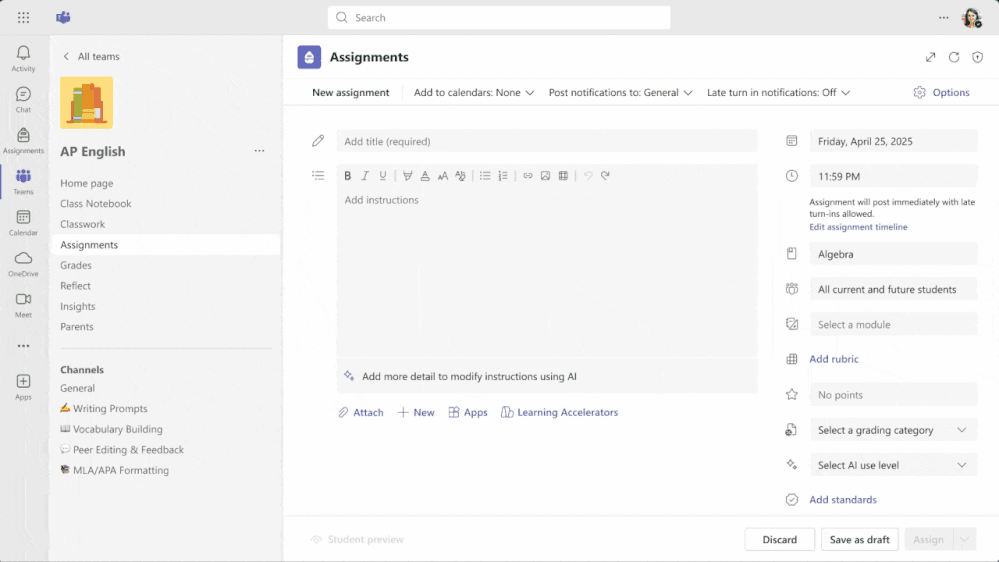 AI teaching tools are also coming to Classwork in Microsoft Teams and OneNote Class Notebook, providing easy ways to create content and share with students all in one place. Starting with lesson plans and flashcards in Teams today, and other features from Teach coming later to Teams and Class Notebook.