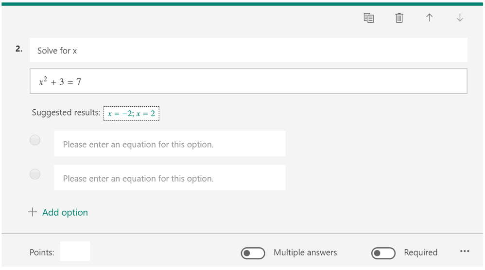 If you picked a Choice question, some equations will trigger a correct answer suggestion after typing in your equation. Click on the suggested option to add it as a choice.