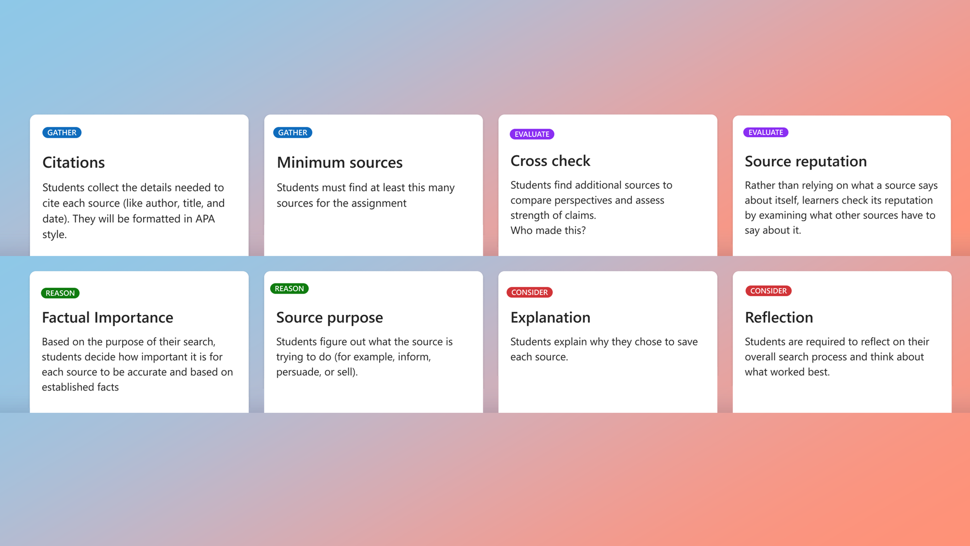 Teacher librarians, in particular, have told us that the “process over product” approach gives them something they’ve been missing — visibility into the process of student inquiry, not just what they turn in. These features give them a window into the journey, not just the destination. With new scaffolds that support cross-checking and the investigation of source reputation, Search Progress now covers more of the skills they’ve been trying to teach.