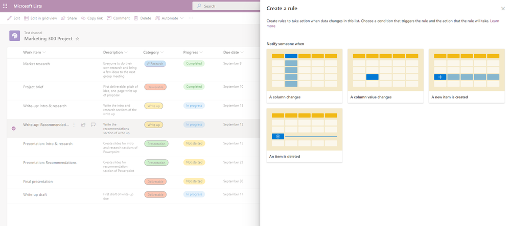 Lists also lets you add rules and notifications to items, triggering reminders to specified class members with upcoming due dates. For example, students working on a group project can set up email notifications to each assigned member when an item deadline is coming up.
