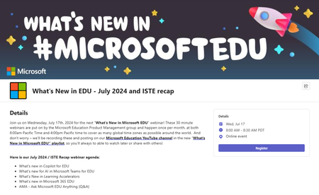 Join us on Wednesday, July 17th, 2024 for our latest "What's New in Microsoft EDU" webinar! These 30 minute webinars are put on by the Microsoft Education Product Management group and happen once per...