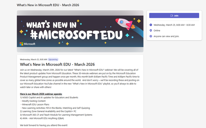 Join us on Wednesday, March 25th, 2026 for our latest "What's New in Microsoft EDU" webinar! We will be covering all of the latest product updates from Microsoft Education. These 30-minute webinars are put on by the Microsoft Education Product Management group and happen once per month, this month both 8:00am Pacific Time and 4:00pm Pacific time to cover as many global time zones as possible around the world. And don’t worry – we’ll be recording these and posting on our Microsoft Education YouTube channel in the new “What’s New in Microsoft EDU” playlist, so you’ll always to able to watch later or share with others!