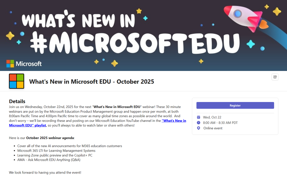 Join us on Wednesday, October 22nd, 2025 for our latest "What's New in Microsoft EDU" webinar! These 30-minute webinars are put on by the Microsoft Education Product Management group and happen once per month, this month both 8:00am Pacific Time and 4:00pm Pacific time to cover as many global time zones as possible around the world. And don’t worry – we’ll be recording these and posting on our Microsoft Education YouTube channel in the new “What’s New in Microsoft EDU” playlist, so you’ll always to able to watch later or share with others!