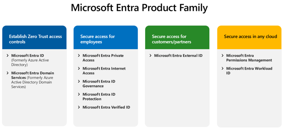 Estos son los productos y soluciones clave dentro de la familia de productos Microsoft Entra.