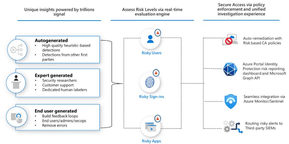- Microsoft Entra ID Protection ayuda a las organizaciones a detectar, investigar y corregir los riesgos basados en la identidad. Estos riesgos pueden integrarse en herramientas como el acceso condicional para tomar decisiones de acceso, o retroalimentar una herramienta de administración de eventos e información de seguridad (SIEM) para una mayor investigación y correlación.