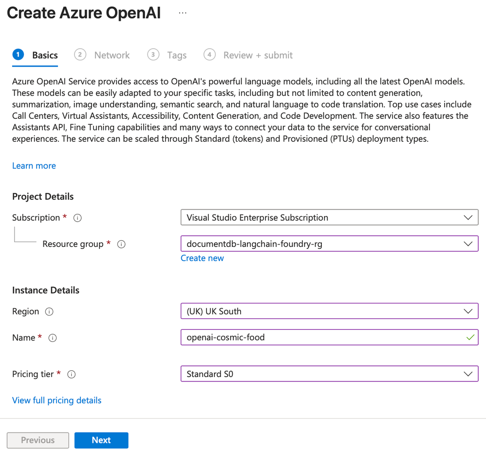 In this step, you create an Azure OpenAI Service resource that enables you to interact with different large language models (LLMs).