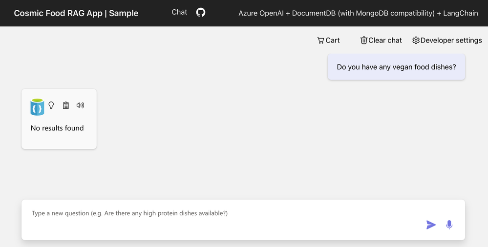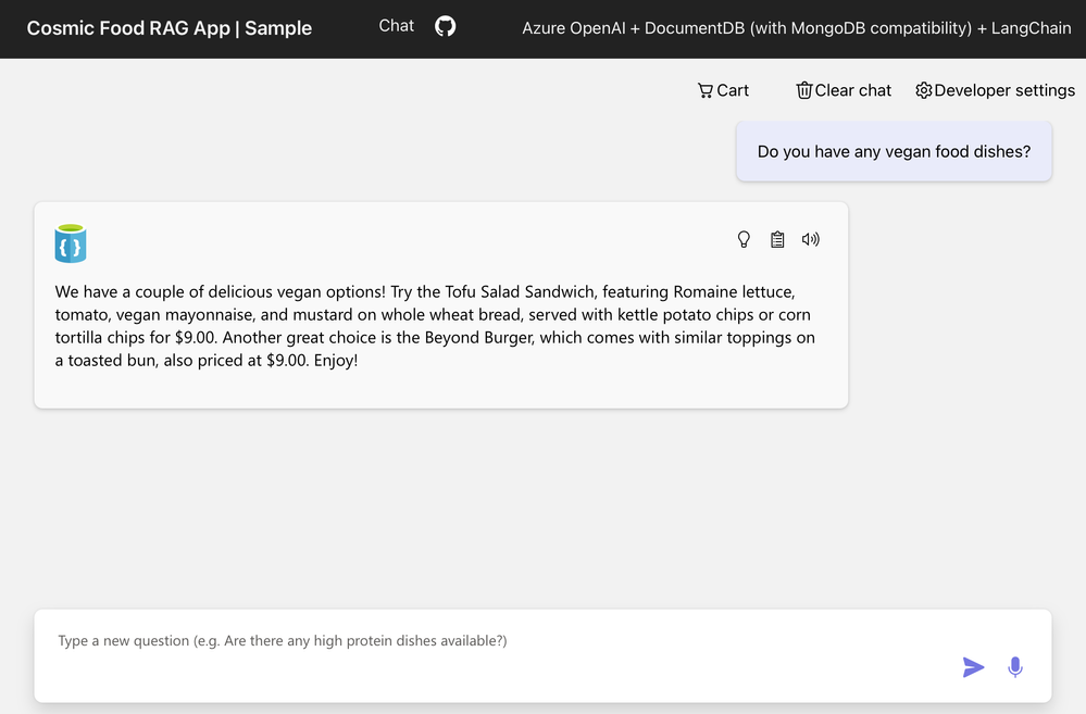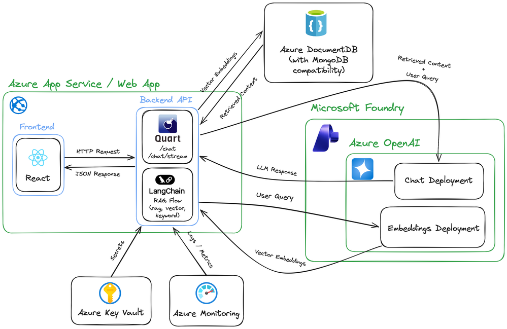 Imagine you are building your company’s RAG chat application using Microsoft Foundry - Azure OpenAI and orchestrating the flow with LangChain. The chat experience works, but now it needs to be grounded in your company’s data. You generate embeddings and want to store and query them without adding another database or complex sync pipeline. Instead of stitching services together, you use Azure DocumentDB (with MongoDB compatibility) with built-in vector search to store your JSON data and embeddings in one place. You deploy the app to Azure App Service and quickly compare vector search alone versus a full RAG pipeline, sharing it with your team for testing.