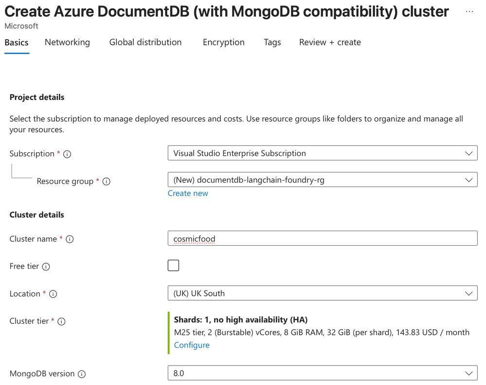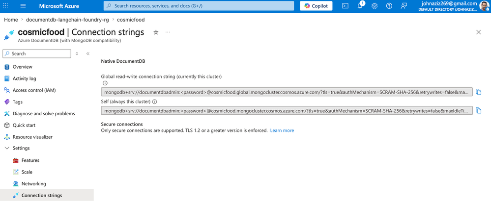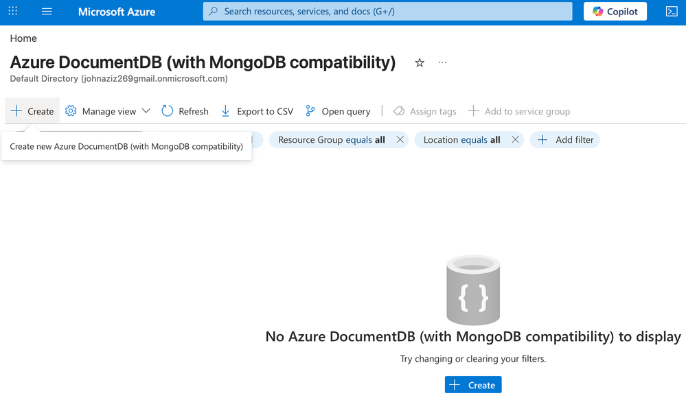 In this step, you create an Azure DocumentDB (with MongoDB compatibility) resource to store your data, vector embedding, and perform vector search.