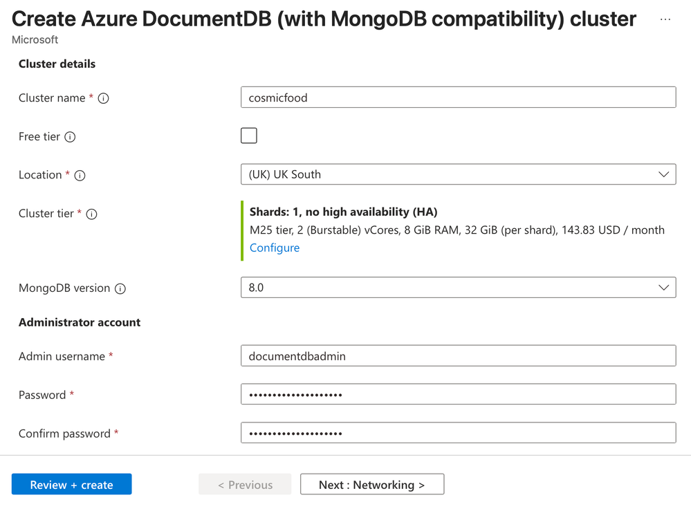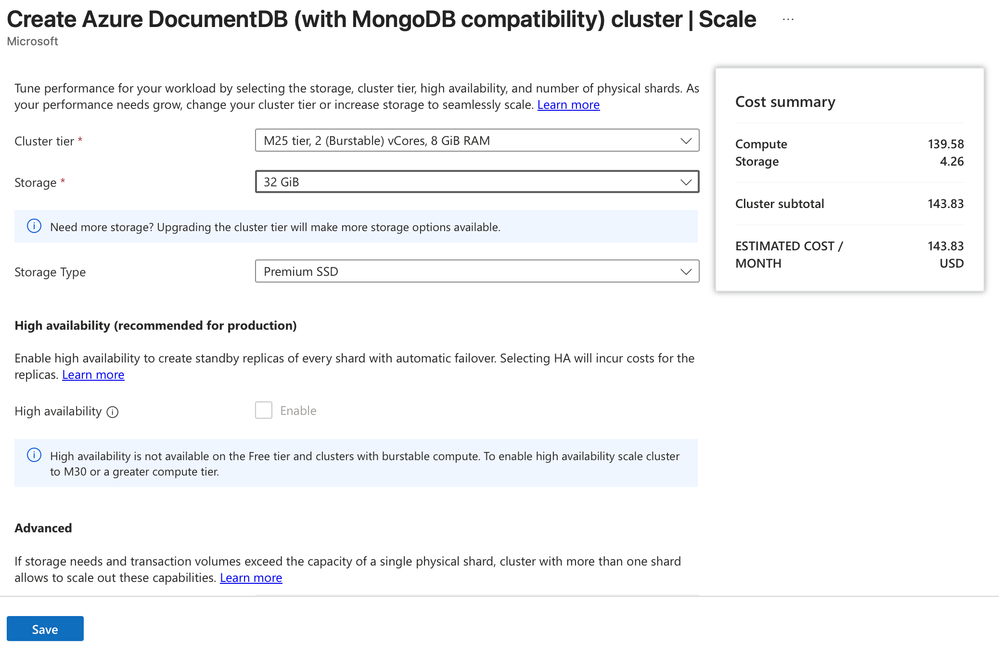 | Cluster tier | Select M25 tier, 2 (Burstable) vCores. |