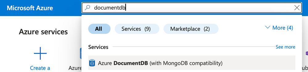 1. Type documentdb in the search bar at the top of the portal page and select Azure DocumentDB (with MongoDB compatibility) from the available options.