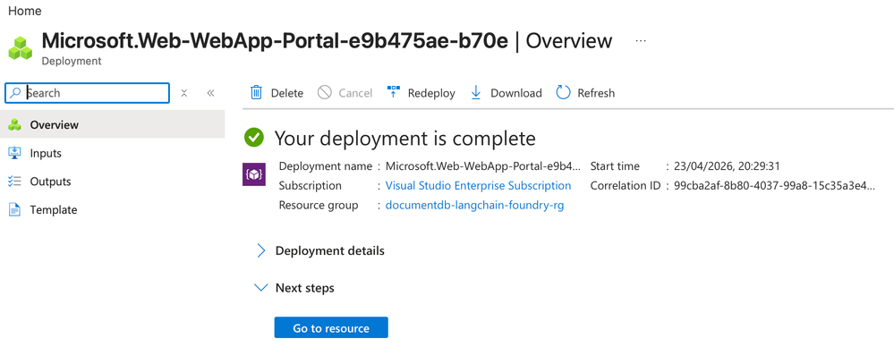 Congratulations! You've learned how to create an Azure DocumentDB (with MongoDB compatibility) cluster, how to create a Microsoft Foundry - Azure OpenAI resource, how to deploy an embedding model and a chat model from the Foundry portal, how to create an Azure App Service and configure continuous deployment with GitHub, and how to modify application settings to enable the communication across Azure resources. By using these technologies, you can build a RAG chat application with the option to perform vector search too over your own data and provide grounded (relevant) responses.
