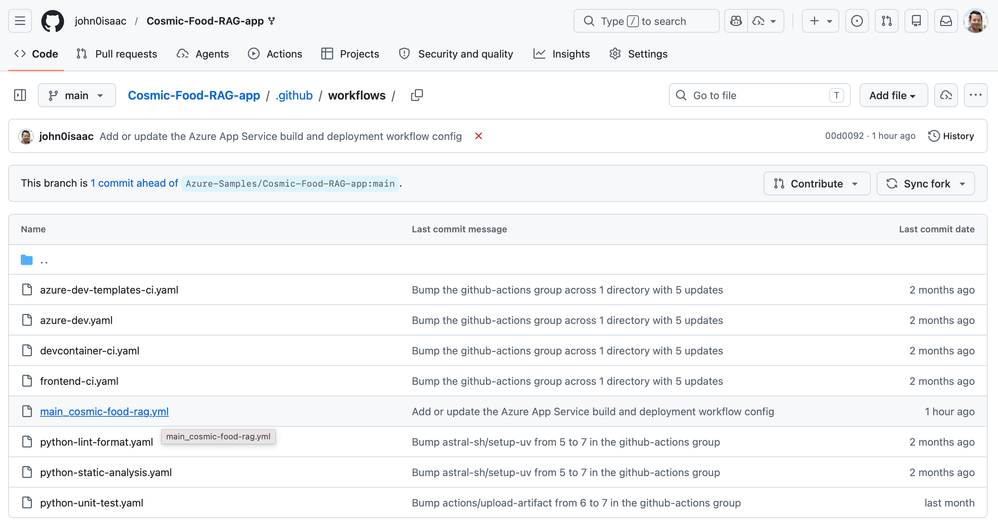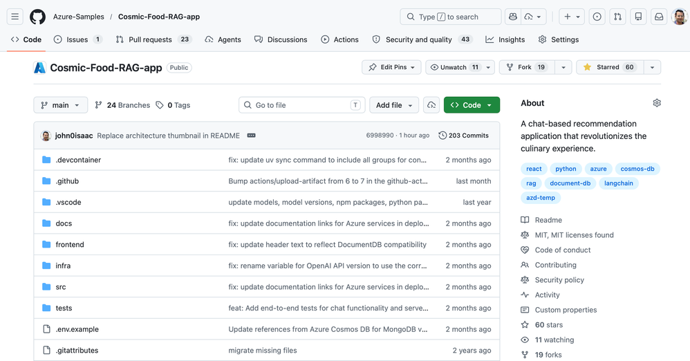 1. Visit the sample github.com/Azure-Samples/Cosmic-Food-RAG-app in your browser and sign in.