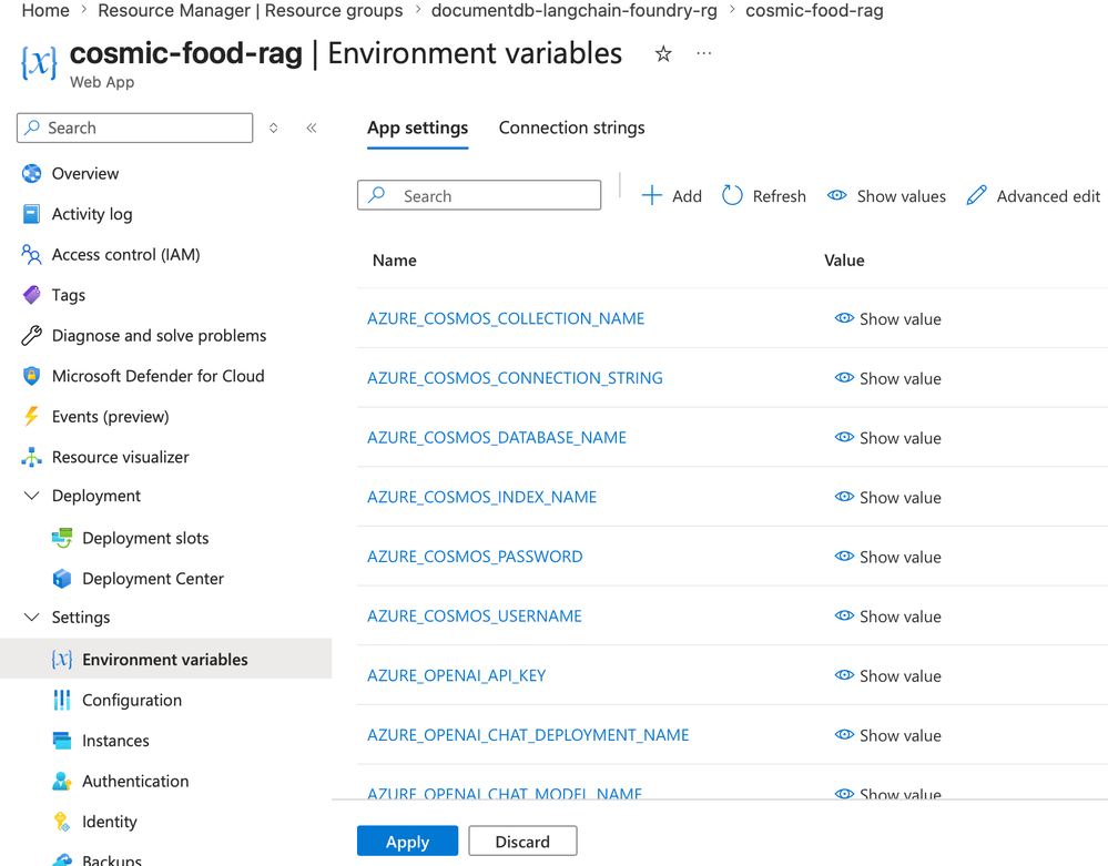 - Modify Azure App Service Application settings in the Azure portal.