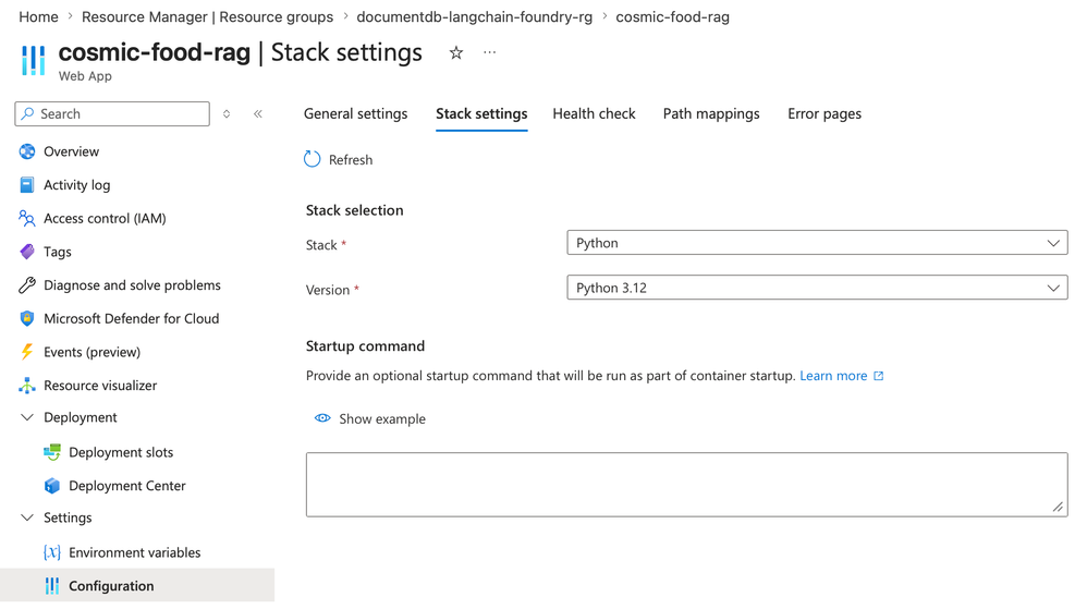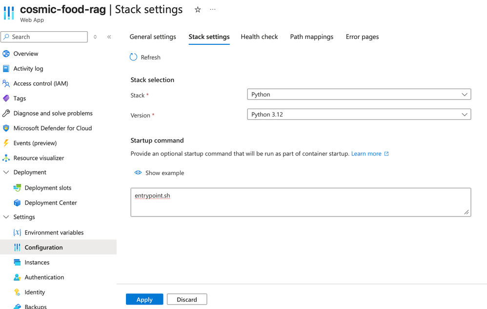 5. Select Configuration then Stack settings to edit the application startup command.