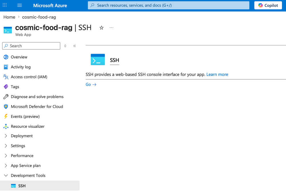 3. Navigate to your Azure App Service resource page and select SSH then select Go to open a new SSH page.4. In the SSH terminal, run these commands: