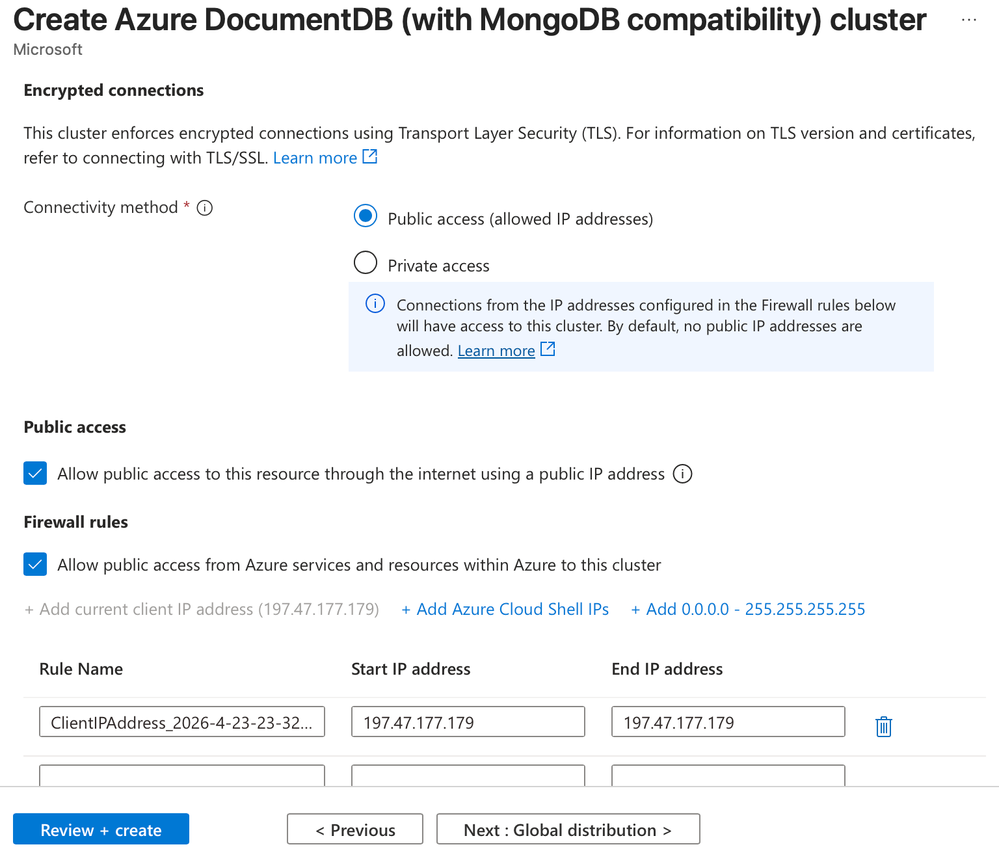 9. Select Allow Public Access from Azure services and resources within the Azure to this cluster.