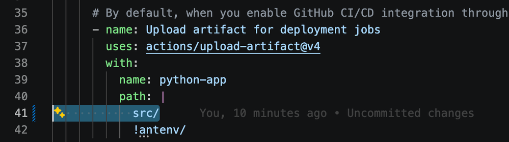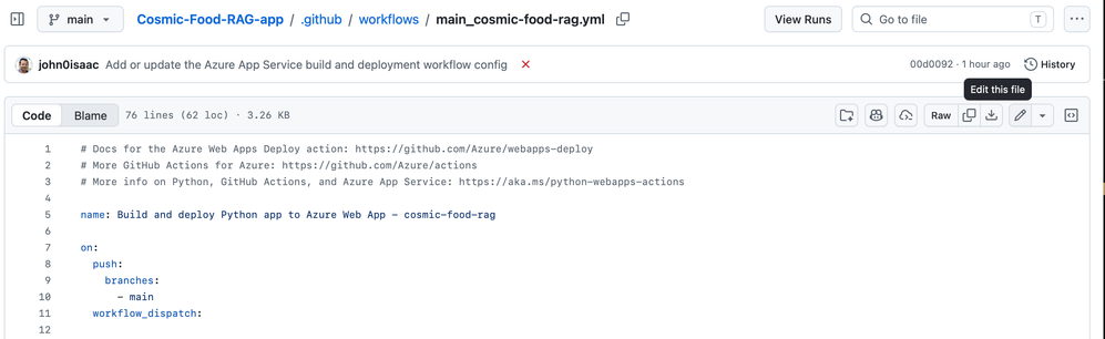 In this step, you modify the GitHub deployment workflow to point to the folder that contains the application.3. Open the file and select the pen icon to edit it.