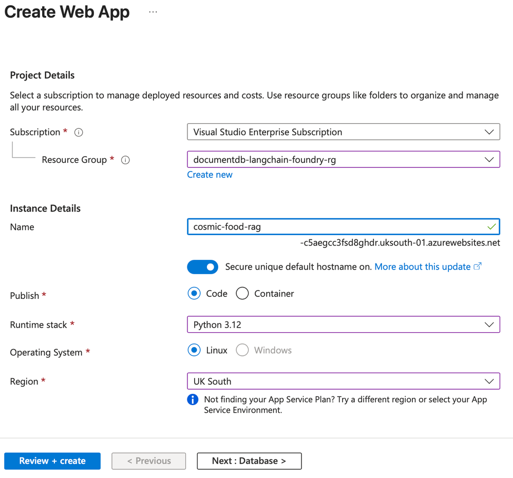 | Region | Select a region close to you for the best response time. For example, Select UK South. |