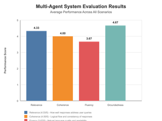 The results showed high scores in relevance (4.33) and groundedness (4.67), confirming the agents’ ability to generate accurate and context-aware responses. However, slightly lower fluency scores and weaker performance in multi-turn tasks revealed a retrieval–execution gap typical in task-oriented dialogue systems.