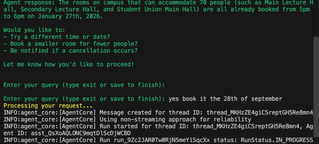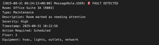 For example, when a maintenance fault is detected, the Maintenance Agent logs the issue, the Scheduling Agent identifies an alternative venue, and the Communications Agent automatically notifies attendees. These interactions happen autonomously, with each agent responding to the evolving context recorded in the shared thread.