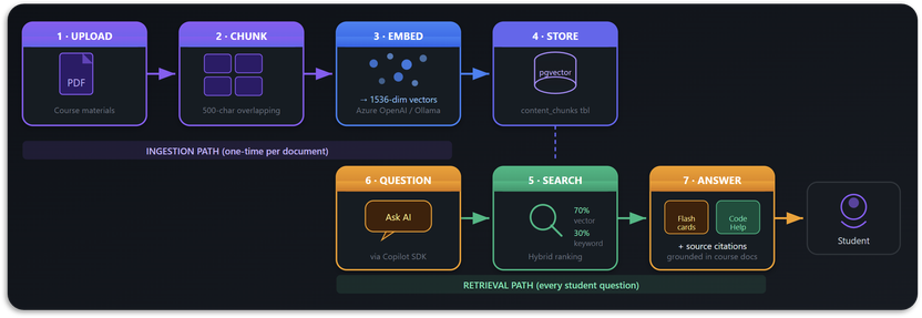 School Agent working architecture with - Frontend, Agent, Backend API, MCP Server and DB (Postgresql + pgvector) componentsWith tools like the Copilot CLI, SDK, and other AI dev tools, experimentation has never been easier and I have so many ideas (I'm sure you do too), of how to make this system even more useful but I'm confident that in a short while, I'll be back with the next set of features built out and working to perfection.