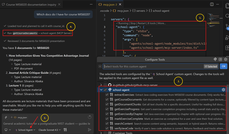 The quickest way to test this MCP setup is with GitHub Copilot as the MCP client, since I'm yet to build any agentic workflows. I'm already on VS Code, so I simply (1) add the mcp server configuration to my .vscode/mcp.json and now the tools are (2) accessible within the Copilot chat window. I start testing with my (3) custom School Agent, comparing different prompts and (4) tool use accuracy to get a feel of how the agent experience would look like in the app. And of course you can use this through the Copilot CLI if you prefer working from the terminal.