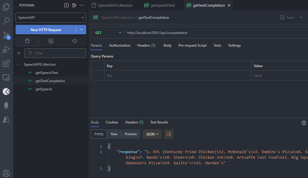 The next endpoint, http://localhost:5001/api/completetext, gets a chat completion or chat response from OpenAI API.