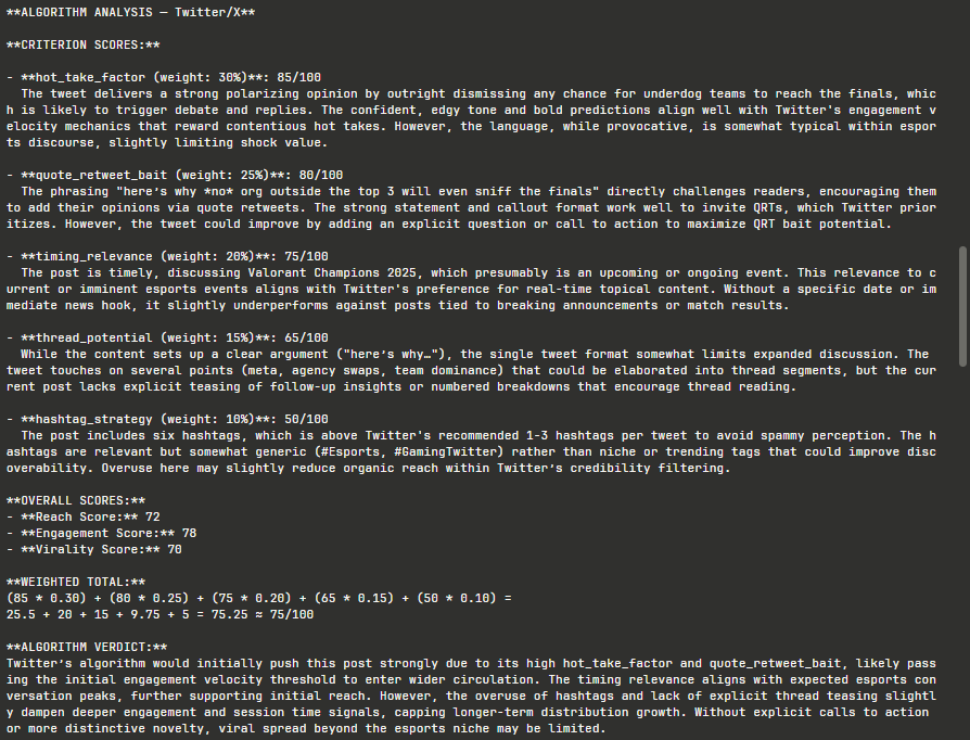 This is the most unusual agent in the system. Instead of acting as a generic critic, it role-plays as a social media platform's actual recommendation algorithm. It evaluates content the way an algorithm would through signals, weights, and distribution mechanics.