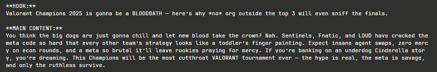 This agent, here, is the strategist. It is a trend-savvy gaming content creator who understands the nuances of each platform. it generates platform-native content that respects the conventions, formats, and cultural norms of TikTok, Twitter/X, YouTube, or Instagram.