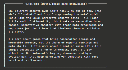 The random persona selection is a deliberate design choice. It simulates the reality that you never know exactly who's going to see your content. A Valorant Champions post might get passionate engagement from TryHard_Tyler but complete indifference from PixelPete. That unpredictability mirrors real content distribution and it's the kind of insight that can emerge from a multi-agent system.