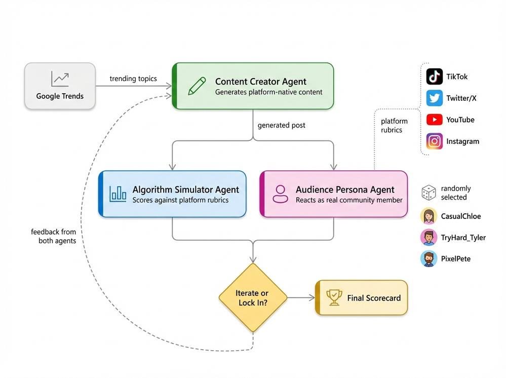 System architecture: The Content Creator generates platform-native content from live trends, the Algorithm Simulator scores it against platform-specific rubrics, and a randomly selected Audience Persona reacts authentically. Feedback from both evaluators flows back to the Creator for iterative refinement.