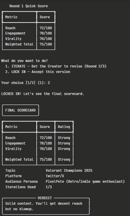 We want to take the system from just a "neat demo" to "actually useful." The pipeline runs for up to three rounds. Each round, the Content Creator either generates fresh content (round 1) or revises based on aggregated feedback (rounds 2-3). The Algorithm Simulator scores it against the platform rubric. The Audience Persona gives an authentic reaction. Then the user decides: iterate or lock in.