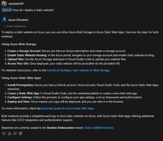 To get deployment related suggestions, use azure in GitHub Copilot’s chat.