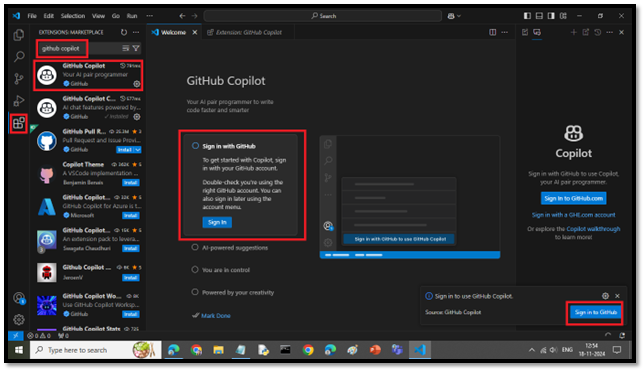 - After this installation, you will be prompted to install – GitHub Copilot, Azure Tools, and other required installations. Click on allow and install all required extensions from the same method, as used above.