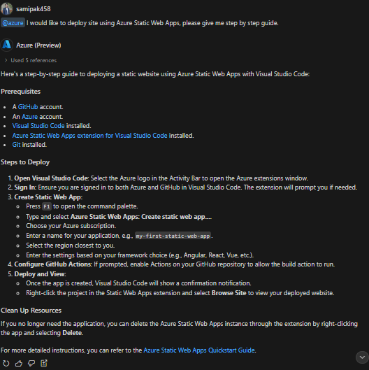 With GitHub Copilot for Azure, deploying applications is now more intuitive than ever. Instead of memorizing complex commands, you can use AI powered prompts to generate deployment steps in real time and even debug the errors within Visual Studio Code.