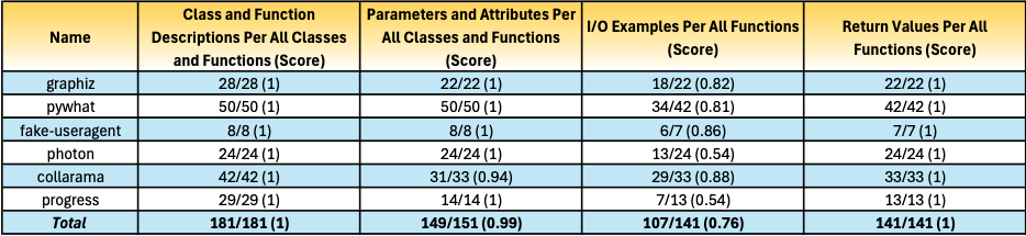 We conducted a quantitative analysis of DocAider's performance across six popular GitHub repositories: collarama, fake-useragent, graphiz, photon, progress, and pywhat. These repositories were selected based on their popularity (over 1000 stars each) and size (small to medium, limited to 20 files per repository). All of them varied in the number of functions and classes. Scores are normalised between 0 and 1, reflecting the presence of these attributes in the documentation. For instance, a score of 1 for Function/Class Description indicates that every class and function in the repository is described in the documentation, while a score of 0.5 for I/O examples means that only half of the functions have I/O examples provided in the documentation.