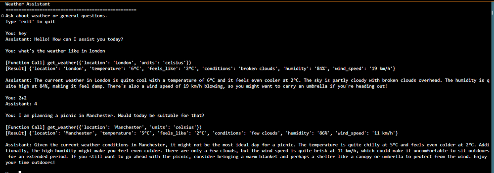 # Foundry Local format message.content = '{"name": "get_weather", "arguments": {"location": "Birmingham"}}'