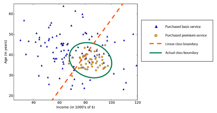 Nonlinear class boundary: Relying on a linear classification algorithm would result in low accuracy.
