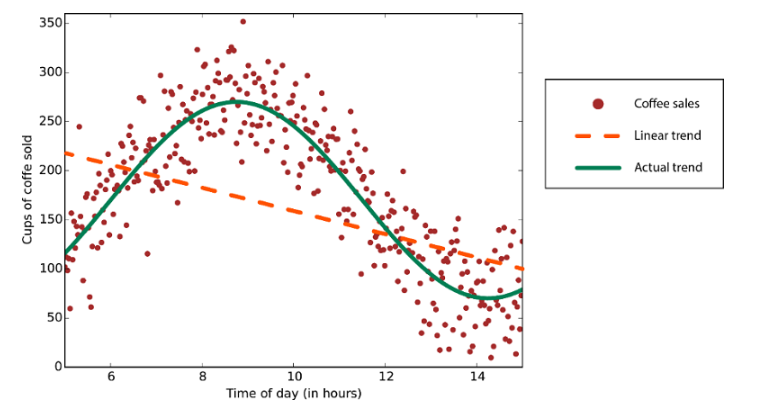 Data with a nonlinear trend: Using a linear regression method would generate much larger errors than necessary.