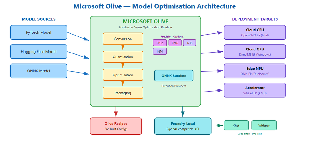 - One source model, many targets: Olive lets you optimise the same model for CPU, GPU, and NPU, expanding your deployment reach without maintaining separate pipelines.