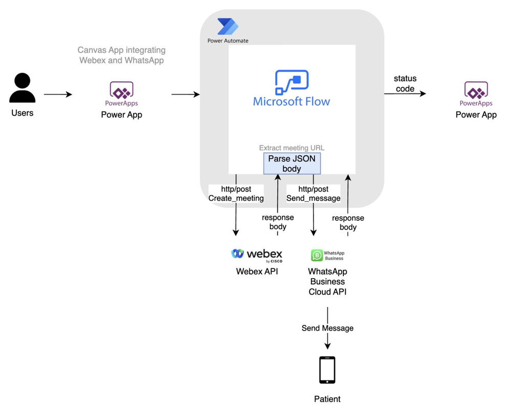 The user interacts with the power app. This is the physical UI the end user sees. The app interacts with power automate Flows. The flows are what give the connector real meaning by providing a context for them to be run. In our Power App, when a meeting for a patient is to be created, the WebEx Connector sends a POST request to the API which responds with the JSON body. The JSON body is parsed to extract the meeting link. The outlook connector then uses the date set on the power app, to add the URL on that date by also sending a POST request. The WhatsApp connector then sends a POST request with the URL to the API to forward the link in a message template.