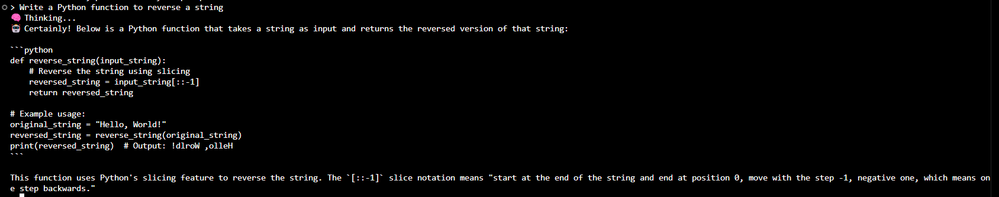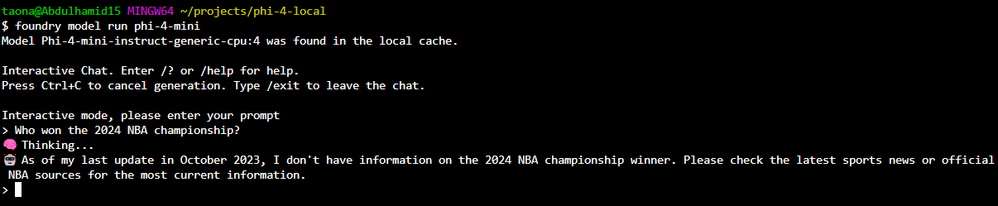 Once the download completes, an interactive session will begin. Let's test Phi-4-mini's capabilities with a few different prompts:
