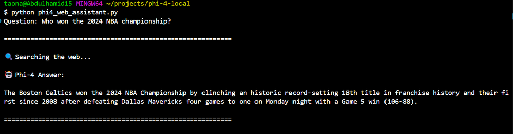 This simple application combines Phi-4's reasoning with real-time web search, allowing it to answer current questions accurately.