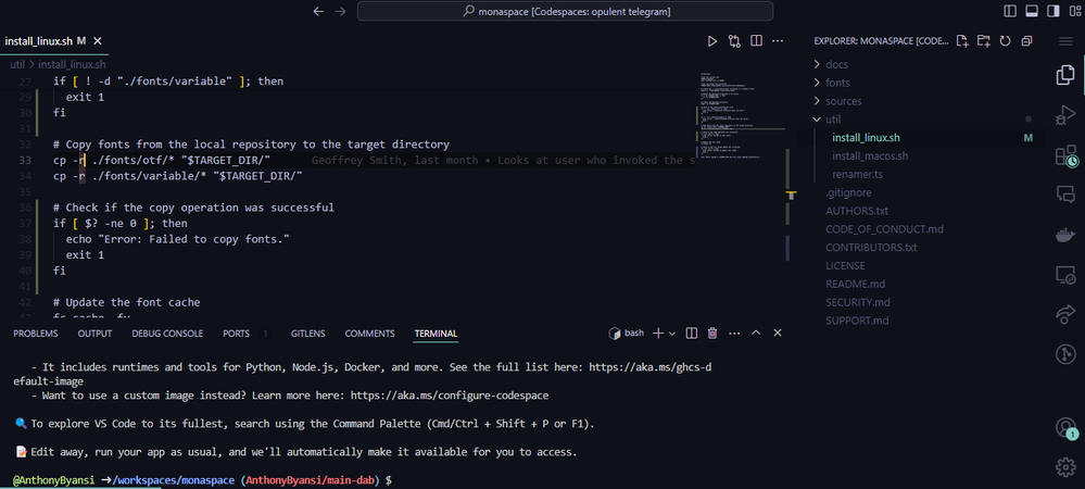 Copilot goes ahead and implements the request file changes which also get reflected in the open Codespaces.