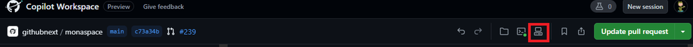 Open a workspace session in a Codespace, by clicking the “Open in Codespace” button in the header bar or in the “Implementation” panel.