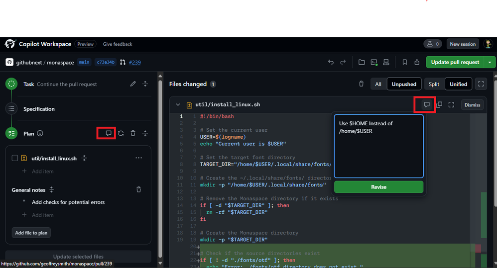 Revise the spec, plan, and code with natural language - In addition to making direct edits to the specification or plan. The same capability is also available on the header for changed files, which allows you to revise code based on a specific instruction (e.g. Use $HOME Instead of /home/$USER) and click revise