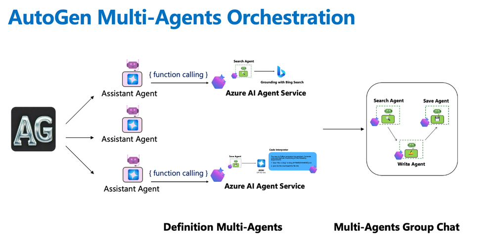 In enterprise scenarios, we have different single agents to help us complete different tasks. Based on different tasks, we can combine different agents to complete related tasks. If we need to send a blog, we can combine the above three agents to complete the task. AutoGen / Semantic Kernel both support the orchestration of agents. We can use AutoGen's Function Calling / Semantic Kernel's Plugin to complete the binding of Azure AI Agent Service to complete the orchestration of the above three agents.